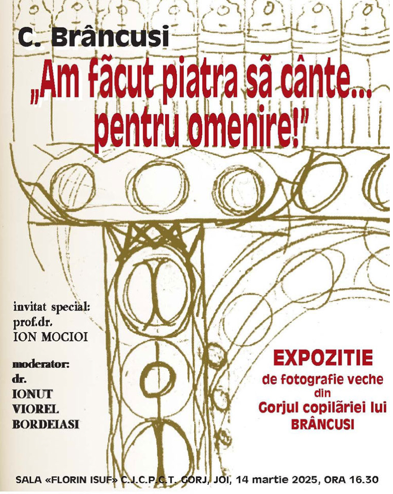 Joi, 13 martie, ora 16.30, la Sala „Florin Isuf” a Centrului Județean pentru Conservarea și Promovarea Culturii Tradiționale Gorj, va avea loc vernisajul unei expoziții de fotografie veche din Gorjul copilăriei lui Constantin Brâncuși.