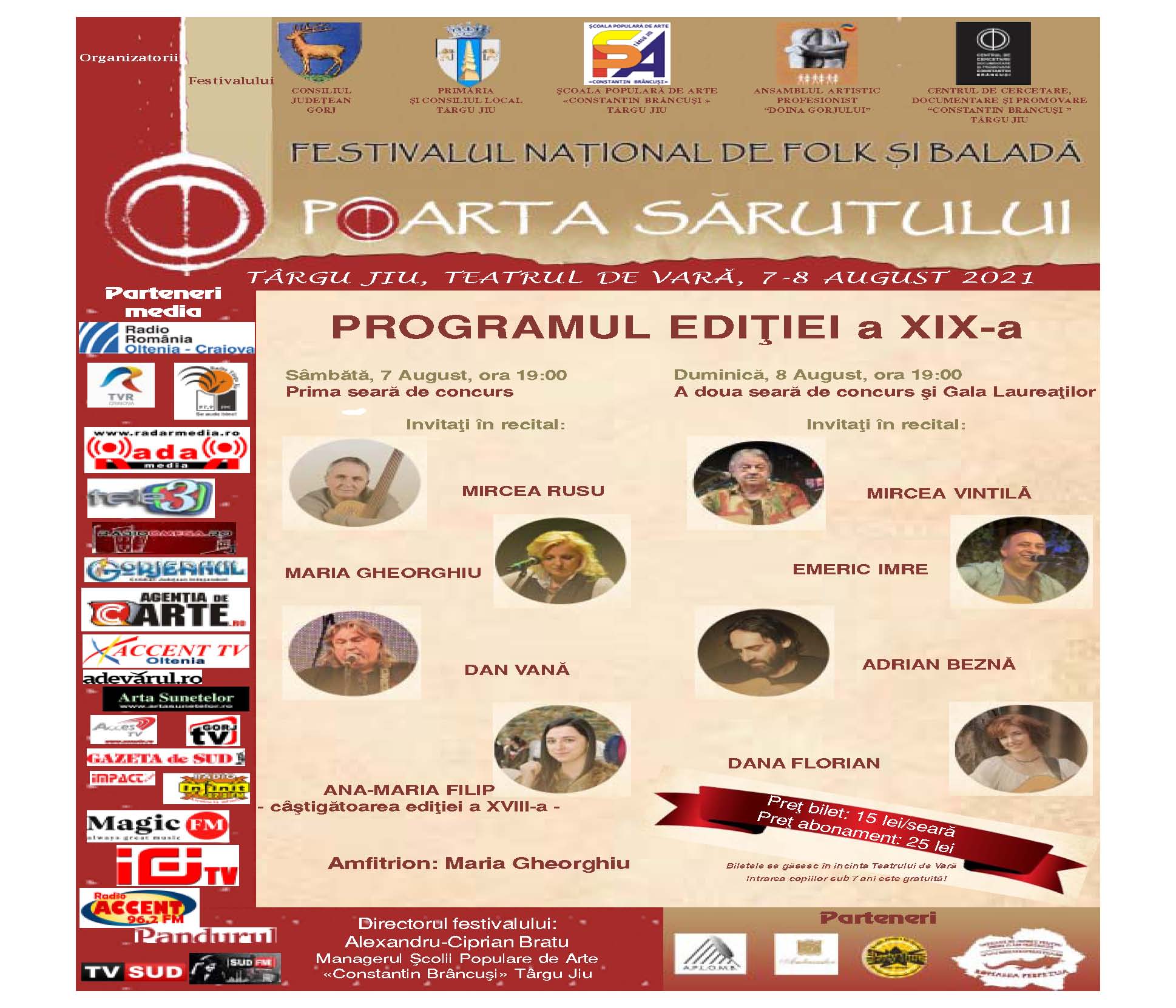Emeric Imre, Adrian Beznă și Mircea Vintilă sunt câțiva dintre invitații celei de-a XIX-a ediții a Festivalului Național de Folk și Baladă ”Poarta Sarutului”, de la Târgu- Jiu. Acesta se va desfășura în perioada 7-8 august, la Teatrul de Vara ”Nelu Dumitru”.