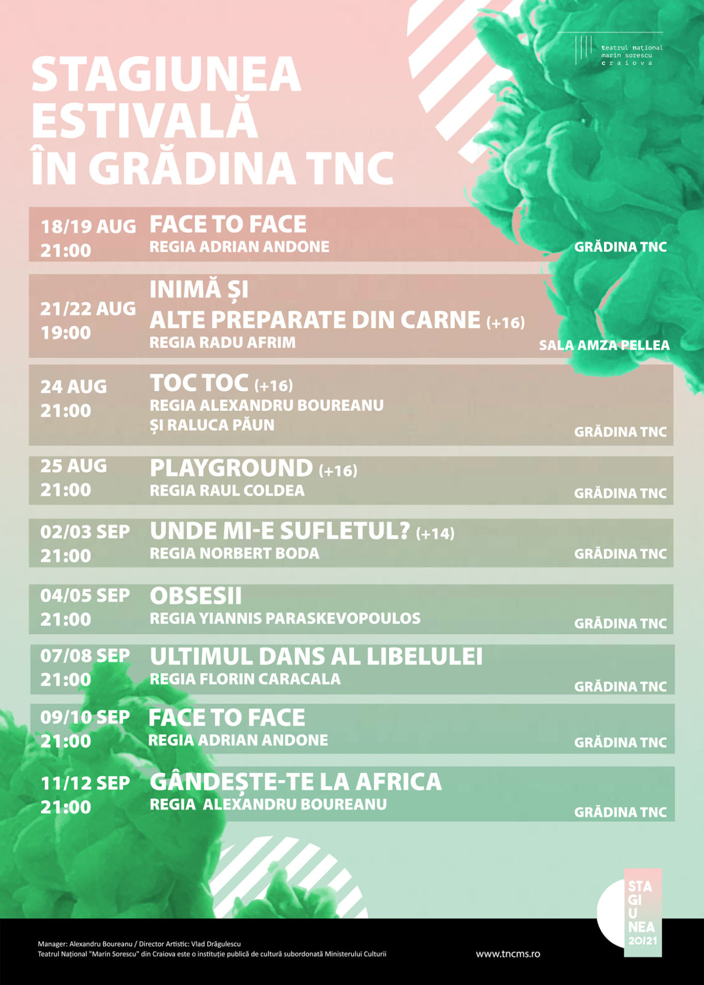 Stagiunea se va desfășura pana pe 12 septembrie, timp în care sunt programate 14 reprezentații în aer liber, in gradina nationalului craiovean, si doua la interior pentru spectacolul Inimă și alte preparate din carne, de Dan Coman, regia, video și univers sonor Radu Afrim, câștigător al Premiului UNITER pentru cel mai bun spectacol al anului 2020.