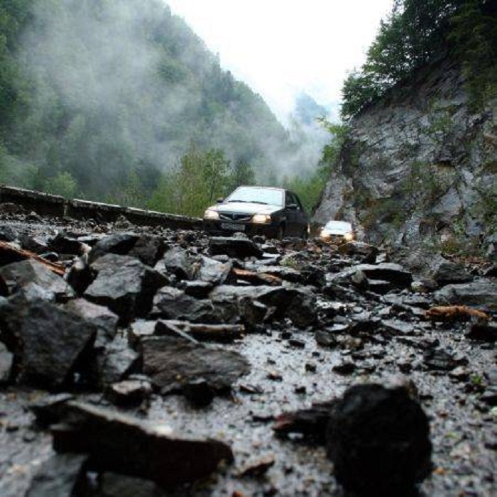 Drumul este blocat din cauza căderilor de pietre și a prăbușirii unor arbori de pe versanți pe carosabil.