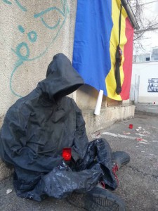 Un artist din Bistrita a adus un omagiu inedit victimelor din clubul Colectiv. Tanarul a realizat o „statuie” neagra, din haine, care sta pe jos, cu o lumanare aprinsa in maini.