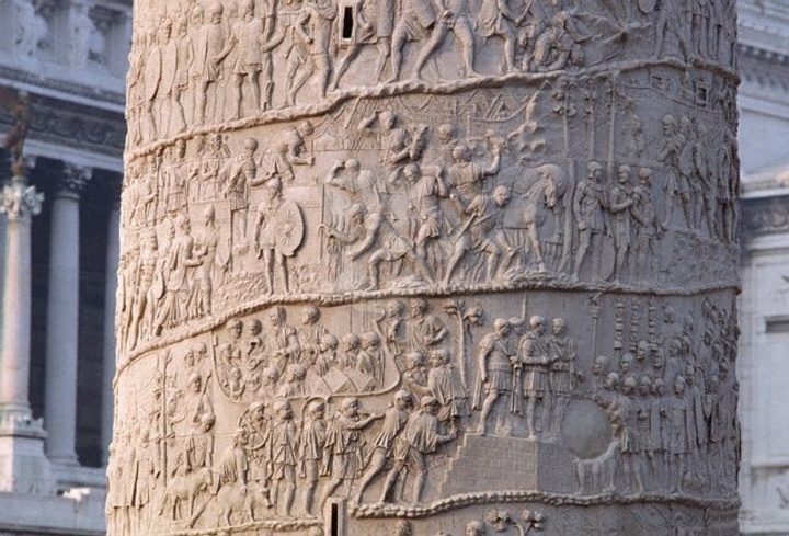 Not available for use in clip art or clip photography product., Detail of the relief sculpture which spirals around Trajan's Column in Rome. The reliefs depict Trajan's victories over the Dacians. | Located in: Trajan's Forum., Property Release: No or not aplicable, Model Release: No or not aplicable, Credit line: Profimedia.com, Corbis
